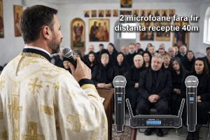 • Set 2 microfoane fără fir – tehnologie UHF, distantă de emisie probată 30m, reglaj independent al volumului fiecărui microfon, functionează fiecare cu 2 baterii AA.
