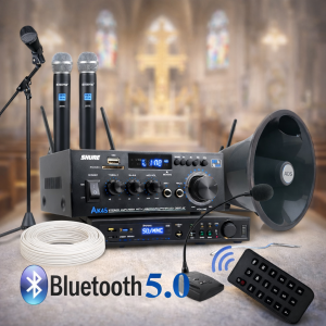 Am pregătit o instalație accesibila și eficientă,  ce are ca element central un amplificator care poate reda, pe o distanță de 500m, sunetul captat de un microfon de masă, microfoane sau lavaliere fără fir, dintr-un telefon prin bluetooth sau alte dispozitive precum cd-player sau mixer.